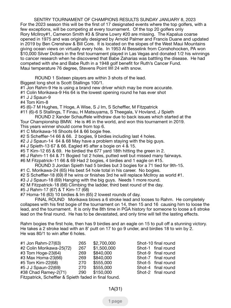 FINAL ROUND Morikawa blows a 6 stroke lead and looses to Rahm. He completely collapses with his first bogie of the tournament on 14, then 15 and 16 causing him to loose the lead, and the tournament. It is only the 8th time in PGA history for someone to loose a 6 stroke lead on the final round. He has to be devastated, and only time will tell the lasting effects.