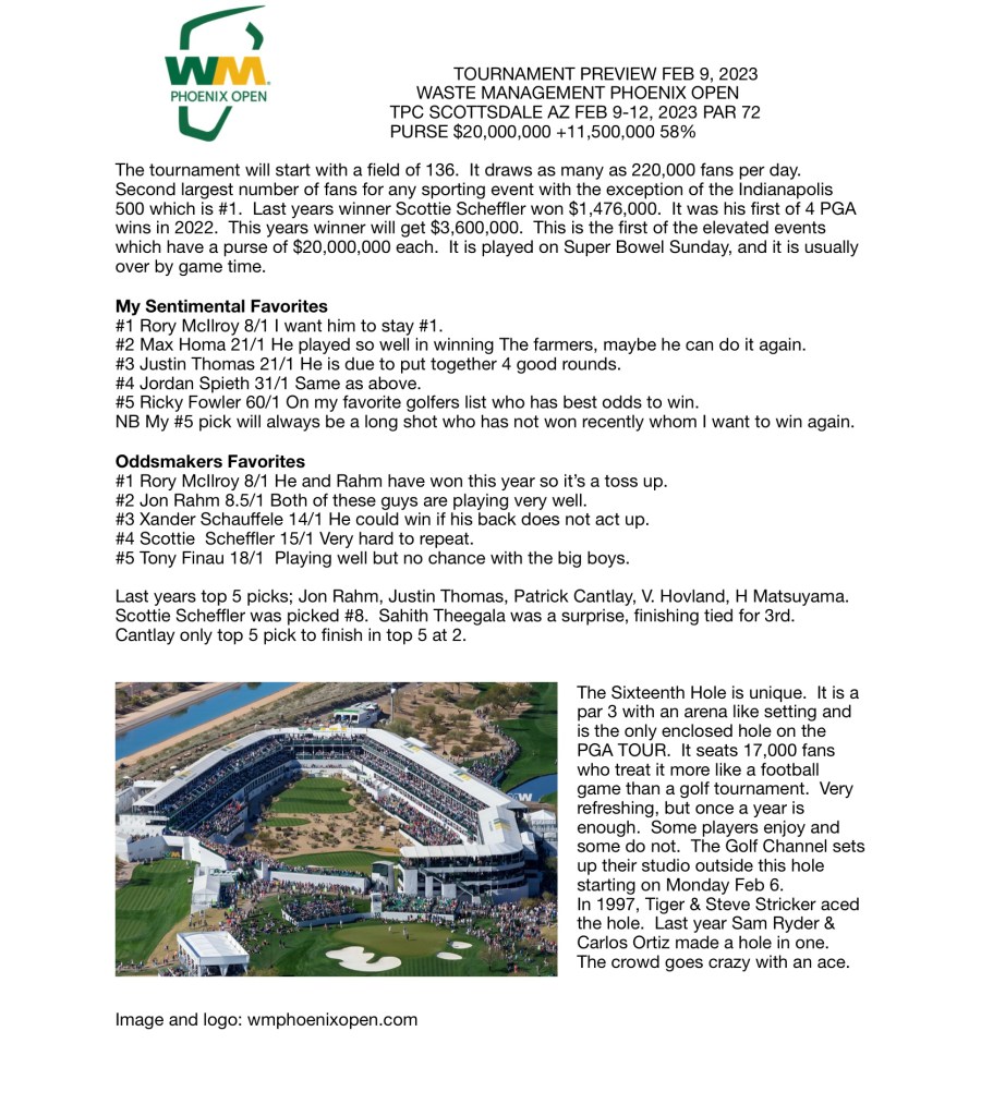 The tournament will start with a field of 136. It draws as many as 220,000 fans per day. Second largest number of fans for any sporting event with the exception of the Indianapolis 500 which is #1. Last years winner Scottie Scheffler won $1,476,000. It was his first of 4 PGA wins in 2022. This years winner will get $3,600,000. This is the first of the elevated events which have a purse of $20,000,000 each. It is played on Super Bowel Sunday, and it is usually over by game time.