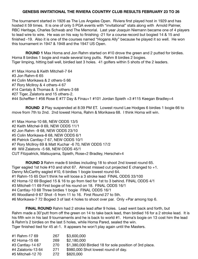 The tournament started in 1926 as The Los Angeles Open. Riviera first played host in 1929 and has hosted it 59 times. It is one of only 5 PGA events with “invitational” stats along with Arnold Palmer, RBC Heritage, Charles Schwab and The Memorial. Last year Joaquin Niemann became one of 4 players to lead wire to wire. He was on his way to finishing -21 for a course record but bogied 14 & 15 and finished -19. Also it is one of the courses named “Hogans Ally” because he played it so well. He won this tournament in 1947 & 1948 and the 1947 US Open.