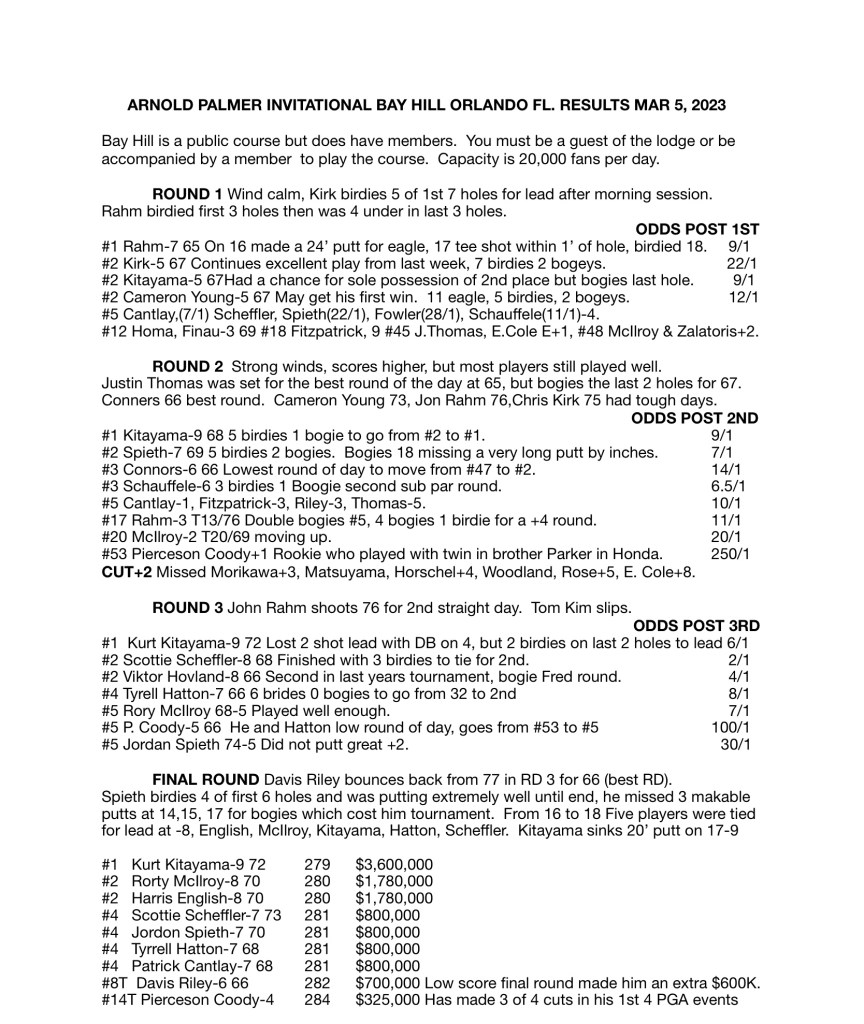 ARNOLD PALMER INVITATIONAL BAY HILL ORLANDO FL. RESULTS MAR 5, 2023