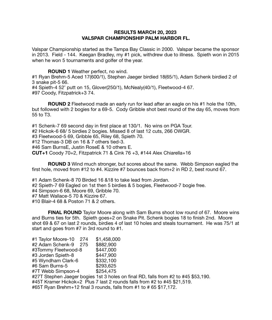 FINAL ROUND Taylor Moore along with Sam Burns shoot low round of 67. Moore wins and Burns ties for 5th. Spieth goes+2 on Snake Pit. Schenk bogies 18 to finish 2nd. Moore shot 69 & 67 on last 2 rounds, birdies 4 of last 10 holes and steals tournament. He was 75/1 at start and goes from #7 in 3rd round to #1.