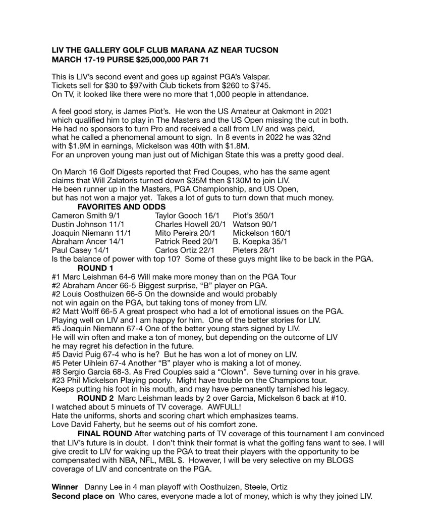 This is LIV’s second event and goes up against PGA’s Valspar. Tickets sell for $30 to $97with Club tickets from $260 to $745. On TV, it looked like there were no more that 1,000 people in attendance. A feel good story, is James Piot’s. He won the US Amateur at Oakmont in 2021 which qualified him to play in The Masters and the US Open missing the cut in both. He had no sponsors to turn Pro and received a call from LIV and was paid, what he called a phenomenal amount to sign. In 8 events in 2022 he was 32nd with $1.9M in earnings, Mickelson was 40th with $1.8M. For an unproven young man just out of Michigan State this was a pretty good deal. On March 16, Golf Digests reported that Fred Coupes, who has the same agent claims that Will Zalatoris turned down $35M then $130M to join LIV. He been runner up in the Masters, PGA Championship, and US Open, but has not won a major yet. Takes a lot of guts to turn down that much money.