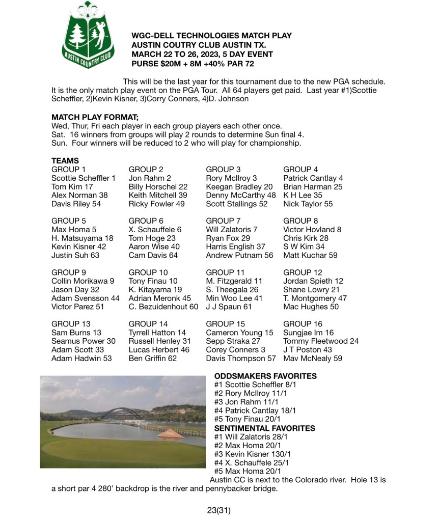 This will be the last year for this tournament due to the new PGA schedule. It is the only match play event on the PGA Tour. All 64 players get paid. Last year #1)Scottie Scheffler, 2)Kevin Kisner, 3)Corry Conners, 4)D. Johnson