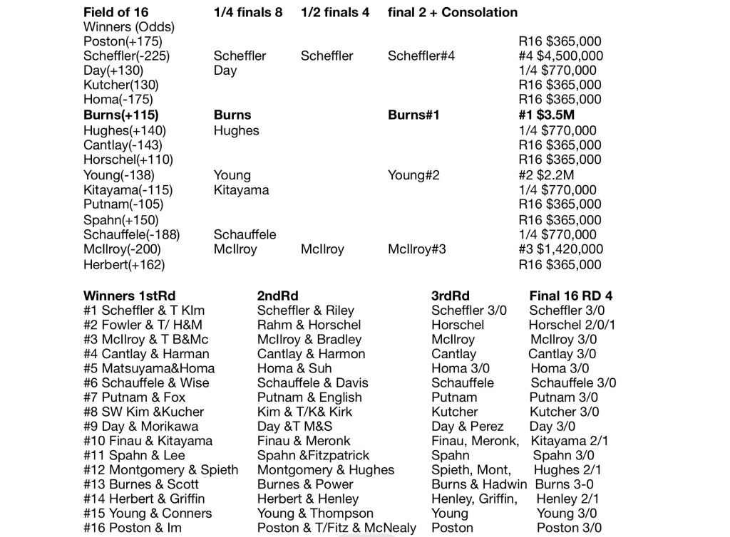 Sam Burns wins 7 of 1st 13 holes, and Young concedes.Rory McIlroy won16 and tied 17 to win consolation match over Scottie Scheffler.