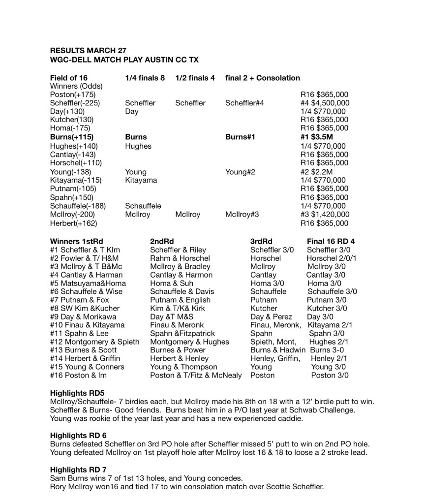 McIlroy/Schauffele- 7 birdies each, but McIlroy made his 8th on 18 with a 12’ birdie putt to win. Scheffler & Burns- Good friends. Burns beat him in a P/O last year at Schwab Challenge. Young was rookie of the year last year and has a new experienced caddie.