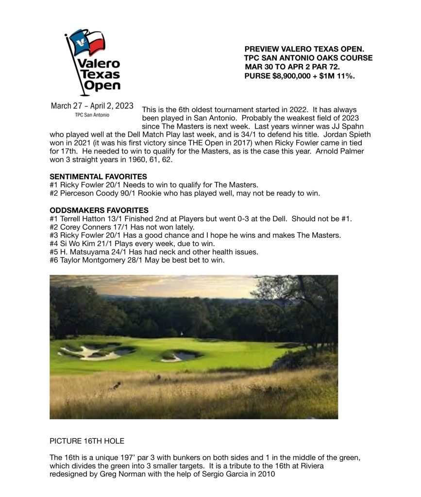 This is the 6th oldest tournament started in 2022. It has always been played in San Antonio. Probably the weakest field of 2023 since The Masters is next week. Last years winner was JJ Spahn who played well at the Dell Match Play last week, and is 34/1 to defend his title. Jordan Spieth won in 2021 (it was his first victory since THE Open in 2017) when Ricky Fowler came in tied for 17th. He needed to win to qualify for the Masters, as is the case this year. Arnold Palmer won 3 straight years in 1960, 61, 62.