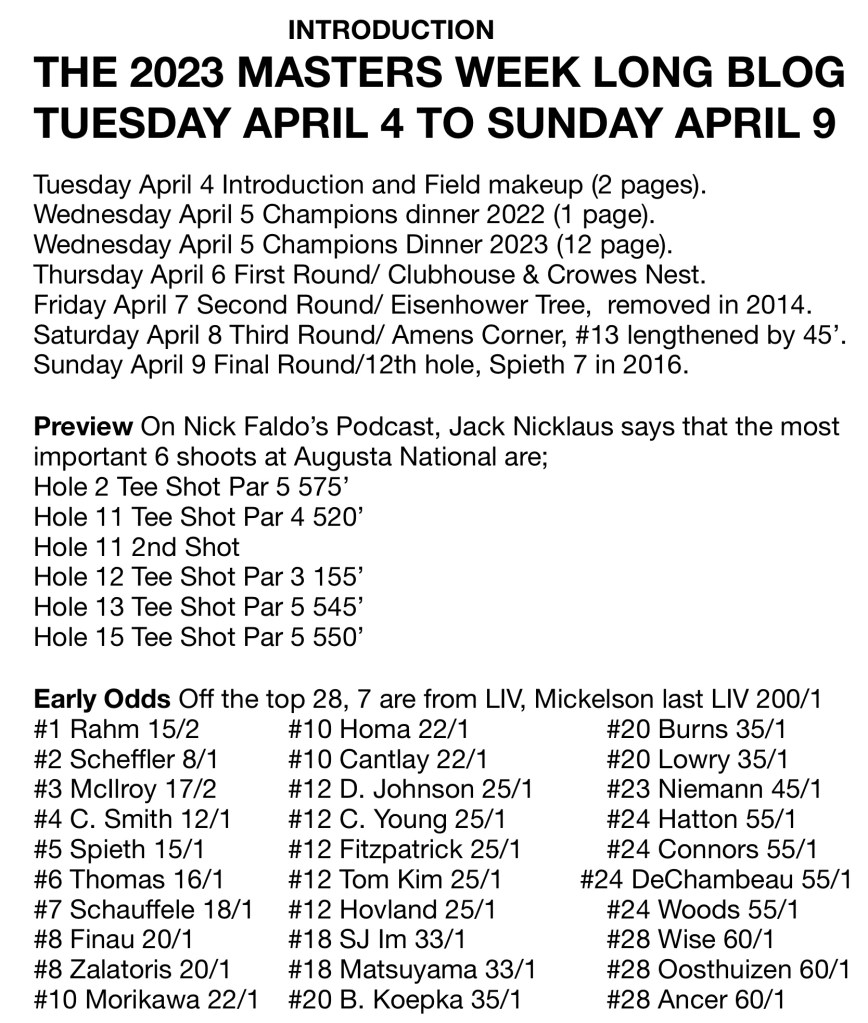 THE 2023 MASTERS WEEK LONG BLOG TUESDAY APRIL 4 TO SUNDAY APRIL 9