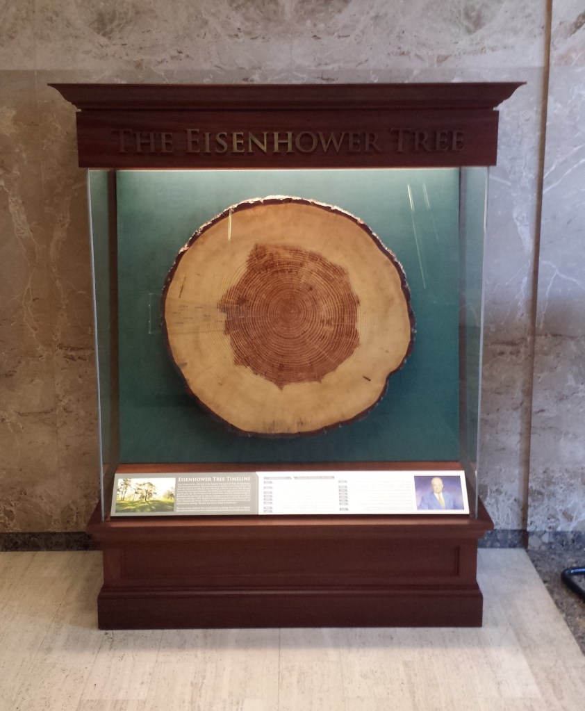 THE EISENHOWER TREE was a loblolly pine located on the 17th hole of Augusta National Golf Club. It was more than 120 years old and stood 65’ high. In the 1950’s it was named after US President Dwight D Eisenhower who in 1956 unsuccessfully lobbied to have it taken down because it interfered with his golf game. Chairman Clifford Roberts denied his request and the tree remained until February of 2014 when it was removed due to damage caused by a major ice storm. A cross-section of the tree was preserved and is on display at the Eisenhower Museum in Abilene KS. A similar cross-section remains at Augusta. Its size, history, and location on a prominent golf course, made it one of the most famous trees in American golf.