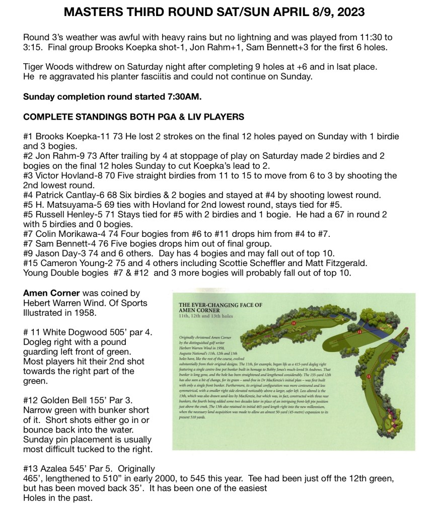 MASTERS THIRD ROUND SAT/SUN APRIL 8/9, 2023