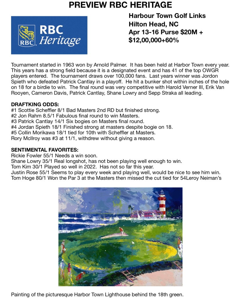 Tournament started in 1963 won by Arnold Palmer. It has been held at Harbor Town every year. This years has a strong field because it is a designated event and has 41 of the top OWGR players entered. The tournament draws over 100,000 fans. Last years winner was Jordon Spieth who defeated Patrick Cantlay in a playoff. He hit a bunker shot within inches of the hole on 18 for a birdie to win. The final round was very competitive with Harold Verner III, Erik Van Rooyen, Cameron Davis, Patrick Cantlay, Shane Lowry and Sepp Straka all leading.