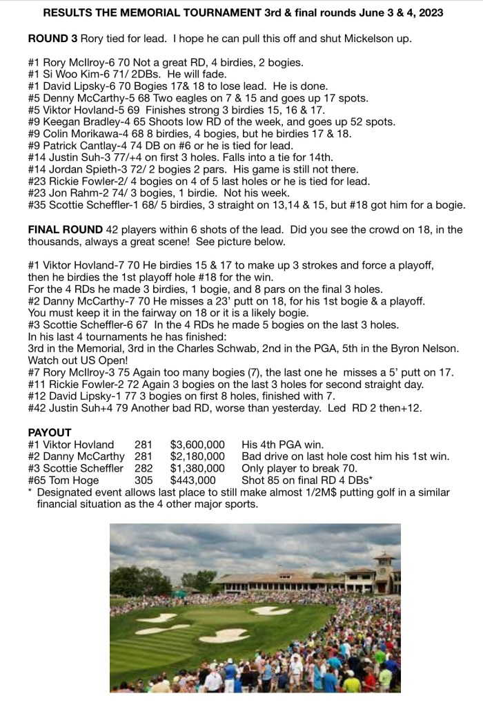 RESULTS THE MEMORIAL TOURNAMENT 3rd & final rounds June 3 & 4, 2023