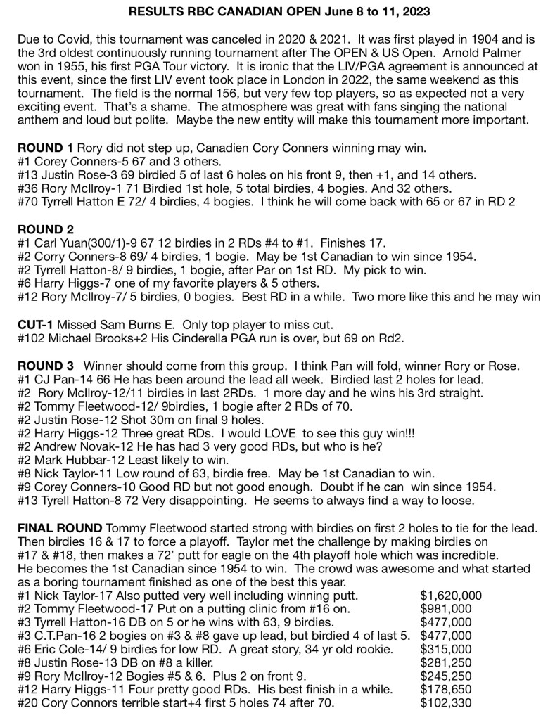 FINAL ROUND Tommy Fleetwood started strong with birdies on first 2 holes to tie for the lead. Then birdies 16 & 17 to force a playoff. Taylor met the challenge by making birdies on #17 & #18, then makes a 72’ putt for eagle on the 4th playoff hole which was incredible. He becomes the 1st Canadian since 1954 to win. The crowd was awesome and what started as a boring tournament finished as one of the best this year.
