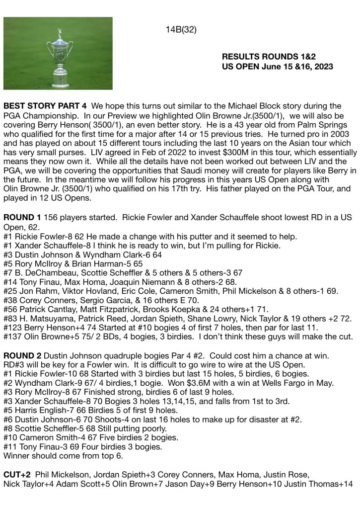 BEST STORY PART 4 We hope this turns out similar to the Michael Block story during the PGA Championship. In our Preview we highlighted Olin Browne Jr.(3500/1), we will also be covering Berry Henson( 3500/1), an even better story. He is a 43 year old from Palm Springs who qualified for the first time for a major after 14 or 15 previous tries. He turned pro in 2003 and has played on about 15 different tours including the last 10 years on the Asian tour which has very small purses. LIV agreed in Feb of 2022 to invest $300M in this tour, which essentially means they now own it. While all the details have not been worked out between LIV and the PGA, we will be covering the opportunities that Saudi money will create for players like Berry in the future. In the meantime we will follow his progress in this years US Open along with Olin Browne Jr. (3500/1) who qualified on his 17th try. His father played on the PGA Tour, and played in 12 US Opens.
