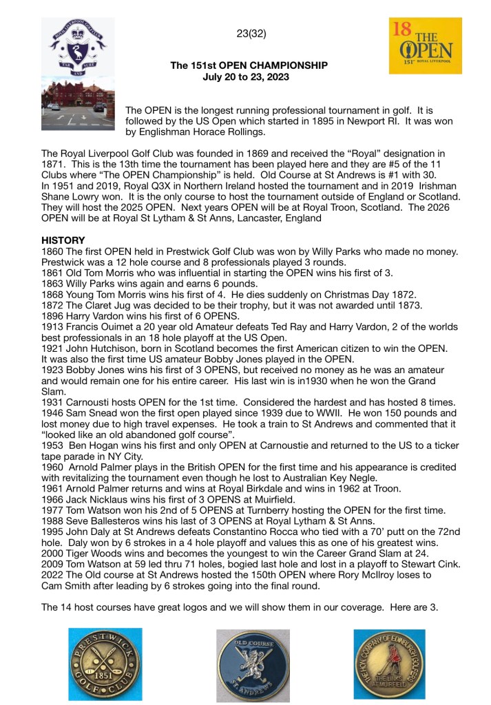 The Royal Liverpool Golf Club was founded in 1869 and received the “Royal” designation in 1871.  This is the 13th time the tournament has been played here and they are #5 of the 11 Clubs where “The OPEN Championship” is held.  Old Course at St Andrews is #1 with 30.