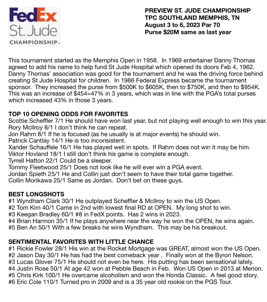 This tournament started as the Memphis Open in 1958. In 1969 entertainer Danny Thomas agreed to add his name to help fund St Jude Hospital which opened its doors Feb 4, 1962. Danny Thomas’ association was good for the tournament and he was the driving force behind creating St Jude Hospital for children. In 1986 Federal Express became the tournament sponsor. They increased the purse from $500K to $605K, then to $750K, and then to $954K. This was an increase of $454=47% in 3 years, which was in line with the PGA’s total purses which increased 43% in those 3 years.