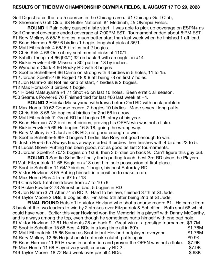 FINAL ROUND Hats off to Victor Hovland who shot a course record 61. He came from 3 back of the two leaders to win by 2 strokes over Fitzpatrick & Scheffler. Both shot 66 which could have won. Earlier this year Hovland won the Memorial in a playoff with Danny McCarthy, and is always among the top, even though he sometimes hurts himself with one bad hole.