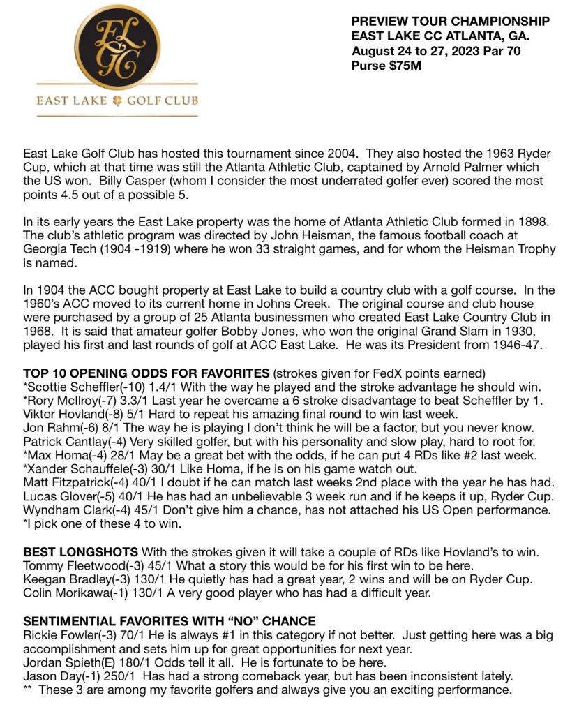 PREVIEW TOUR CHAMPIONSHIP EAST LAKE CC ATLANTA, GA.