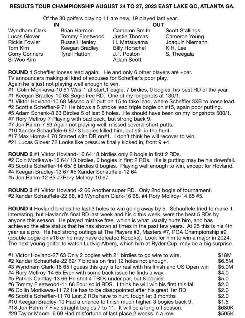 ROUND 4 Hovland birdies the last 3 holes to win going away by 5. Schauffele tried to make it interesting, but Havland’s final RD last week and his 4 this week, were the best 5 RDs by anyone this season. He played mistake free, which is what usually hurts him, and has achieved the elite status that he has shown at times in the past few years. At 25 this is his 4th year as a pro. He had strong outings at The Players #3, Masters #7, PGA Championship #2 (double bogie on #16 or he may have defeated Koepka). Look for him to win a major in 2024. The next young golfer to watch Ludvig Alberg, which him at Ryder Cup, may be a big surprise.