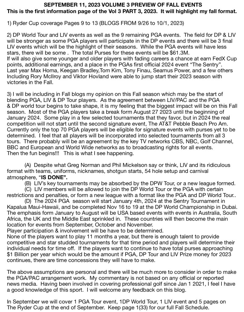 1) Ryder Cup coverage Pages 9 to 13 (BLOGS FROM 9/26 to 10/1, 2023)
