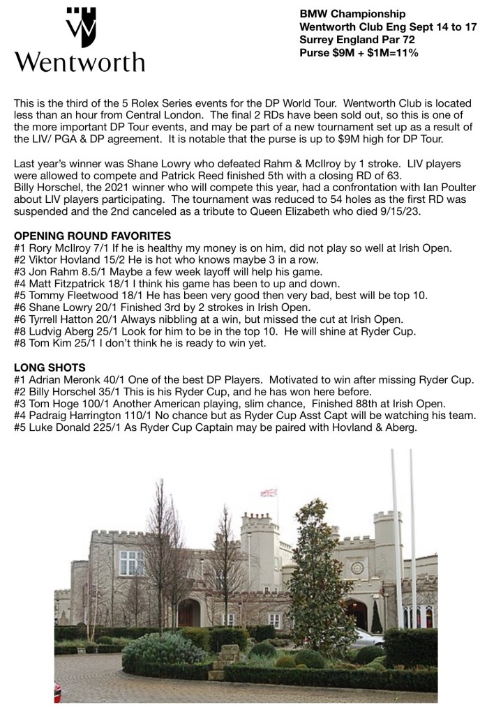 This is the third of the 5 Rolex Series events for the DP World Tour. Wentworth Club is located less than an hour from Central London. The final 2 RDs have been sold out, so this is one of the more important DP Tour events, and may be part of a new tournament set up as a result of the LIV/ PGA & DP agreement. It is notable that the purse is up to $9M high for DP Tour.