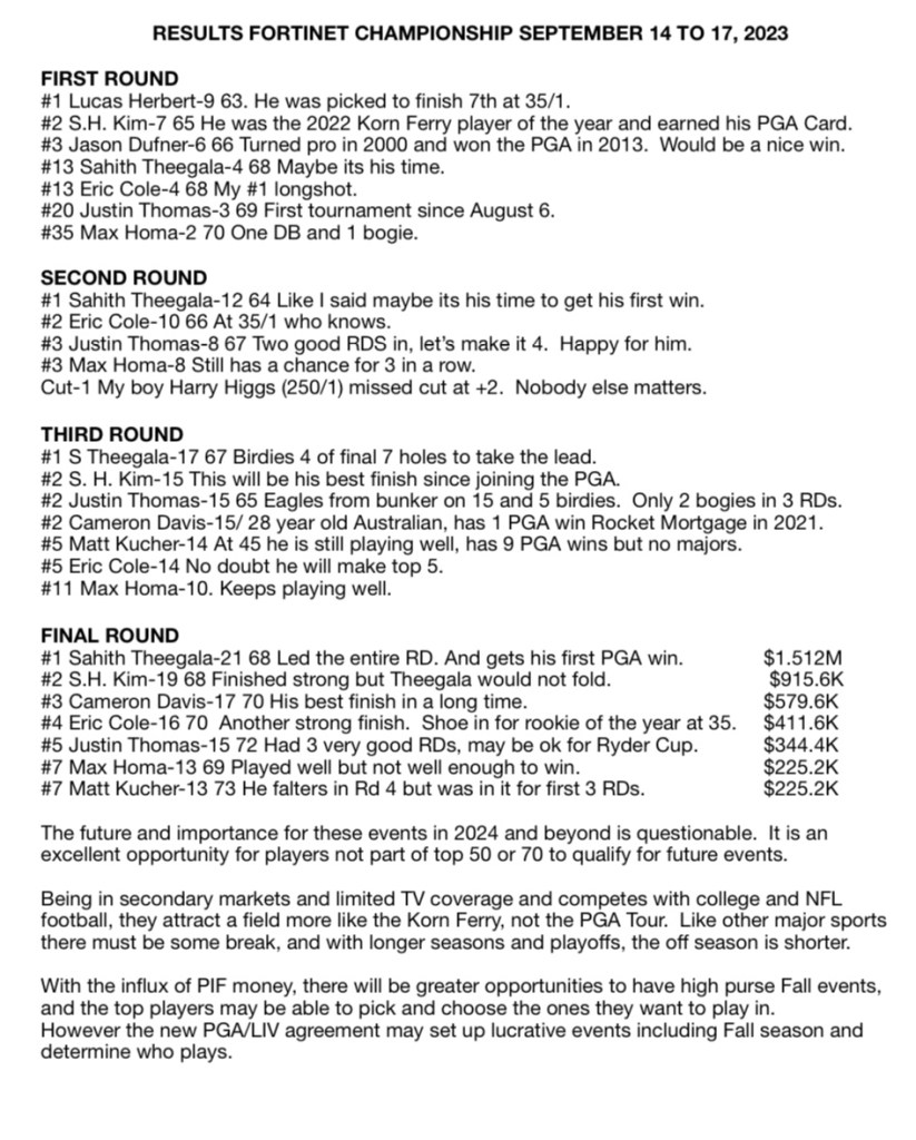 RESULTS FORTINET CHAMPIONSHIP SEPTEMBER 14 TO 17, 2023