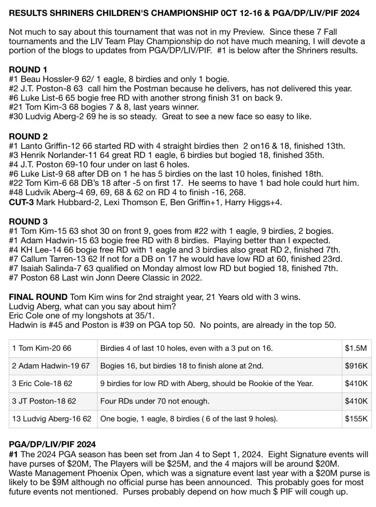 Not much to say about this tournament that was not in my Preview. Since these 7 Fall tournaments and the LIV Team Play Championship do not have much meaning, I will devote a portion of the blogs to updates from PGA/DP/LIV/PIF. #1 is below after the Shriners results.