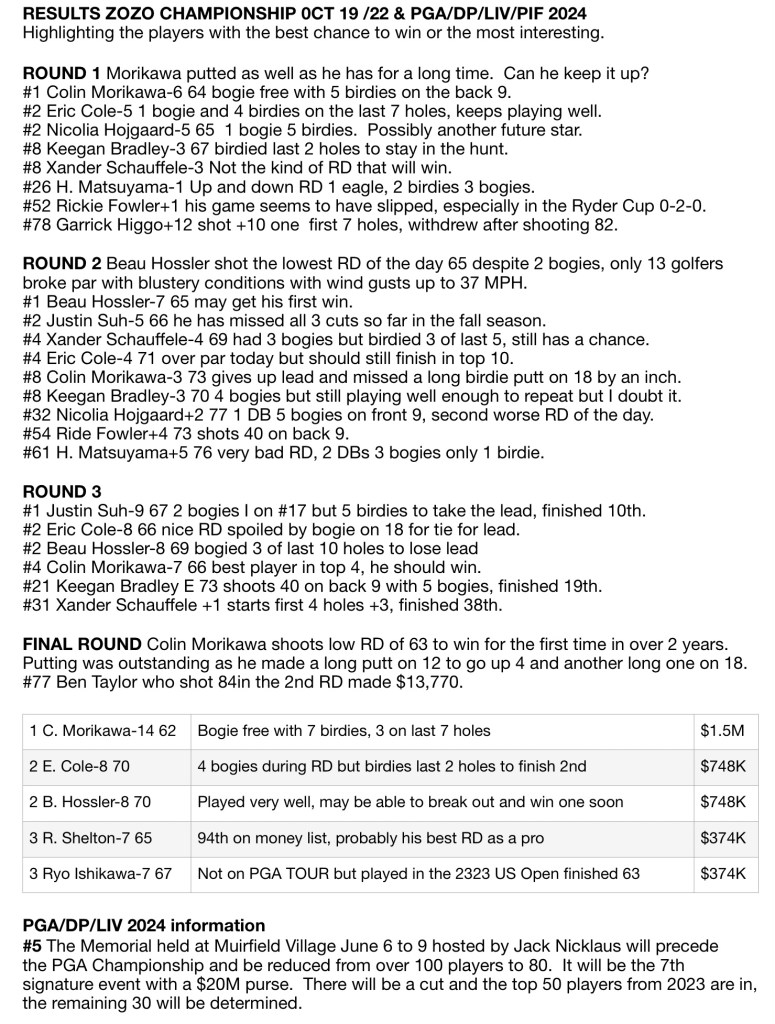RESULTS ZOZO CHAMPIONSHIP 0CT 19 /22 & PGA/DP/LIV/PIF 2024