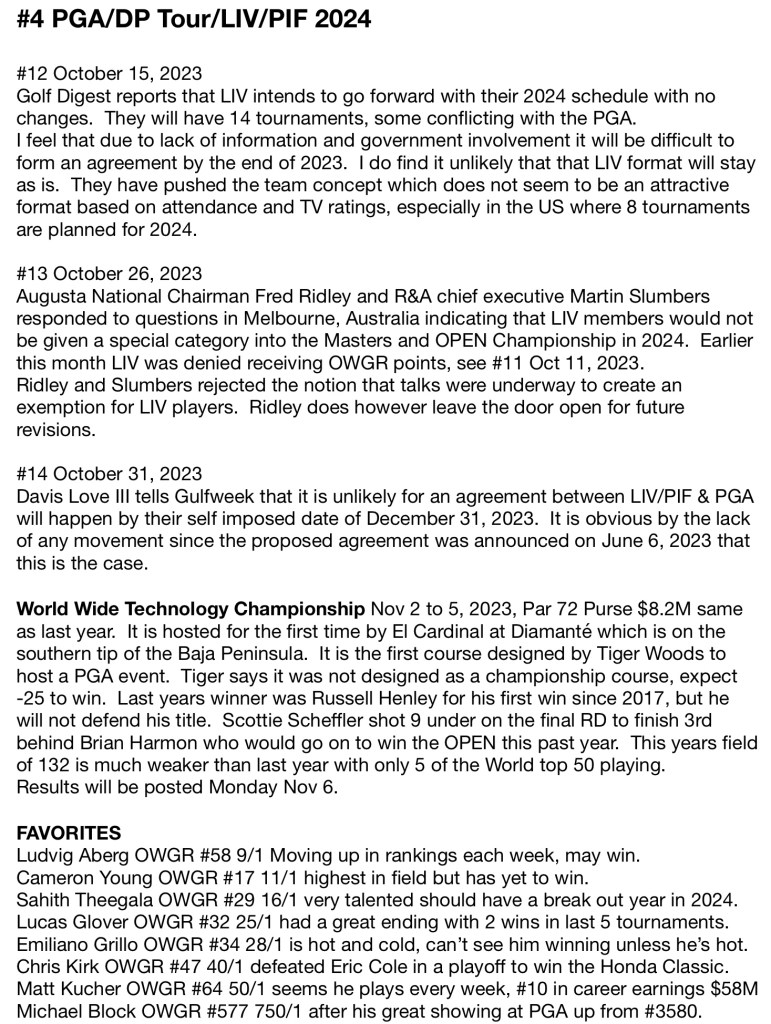 Golf Digest reports that LIV intends to go forward with their 2024 schedule with no changes.  They will have 14 tournaments, some conflicting with the PGA.  I feel that due to lack of information and government involvement it will be difficult to form an agreement by the end of 2023.  I do find it unlikely that that LIV format will stay as is.  They have pushed the team concept which does not seem to be an attractive format based on attendance and TV ratings, especially in the US where 8 tournaments are planned for 2024.