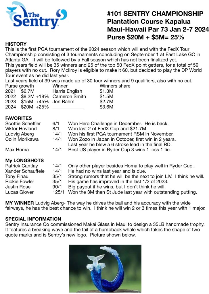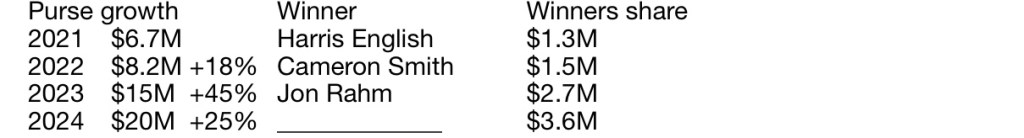 This is the first PGA tournament of the 2024 season which will end with the FedX Tour Championship consisting of 3 tournaments concluding on September 1 at East Lake GC in Atlanta GA. It will be followed by a Fall season which has not been finalized yet.