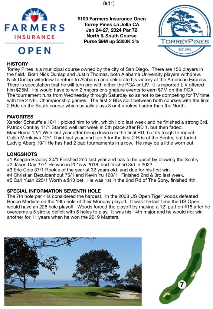 Torrey Pines is a municipal course owned by the city of San Diego. There are 156 players in the field. Both Nick Dunlap and Justin Thomas, both Alabama University players withdrew. Nick Dunlap withdrew to return to Alabama and celebrate his victory at the American Express. There is speculation that he will turn pro with either the PGA or LIV. It is reported LIV offered him $25M. He would have to win 2 majors or signature events to earn $7M on the PGA. The tournament runs from Wednesday through Saturday so as not to be competing for TV time with the 2 NFL Championship games. The first 2 RDs split between both courses with the final 2 Rds on the South course which usually plays 3 or 4 strokes harder than the North.