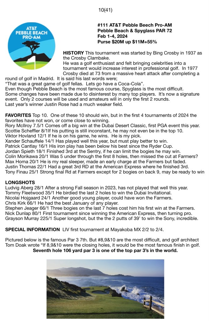 HISTORY This tournament was started by Bing Crosby in 1937 as the Crosby Clambake. He was a golf enthusiast and felt bringing celebrities into a tournament would increase interest in professional golf. In 1977 Crosby died at 73 from a massive heart attack after completing a round of golf in Madrid. It is said his last words were; “That was a great game of golf fellas. Lets go have a Coca-Cola”. Even though Pebble Beach is the most famous course, Spyglass is the most difficult. Some changes have been made due to disinterest by many top players. It’s now a signature event. Only 2 courses will be used and amateurs will in only the first 2 rounds. Last year’s winner Justin Rose had a much weaker field.