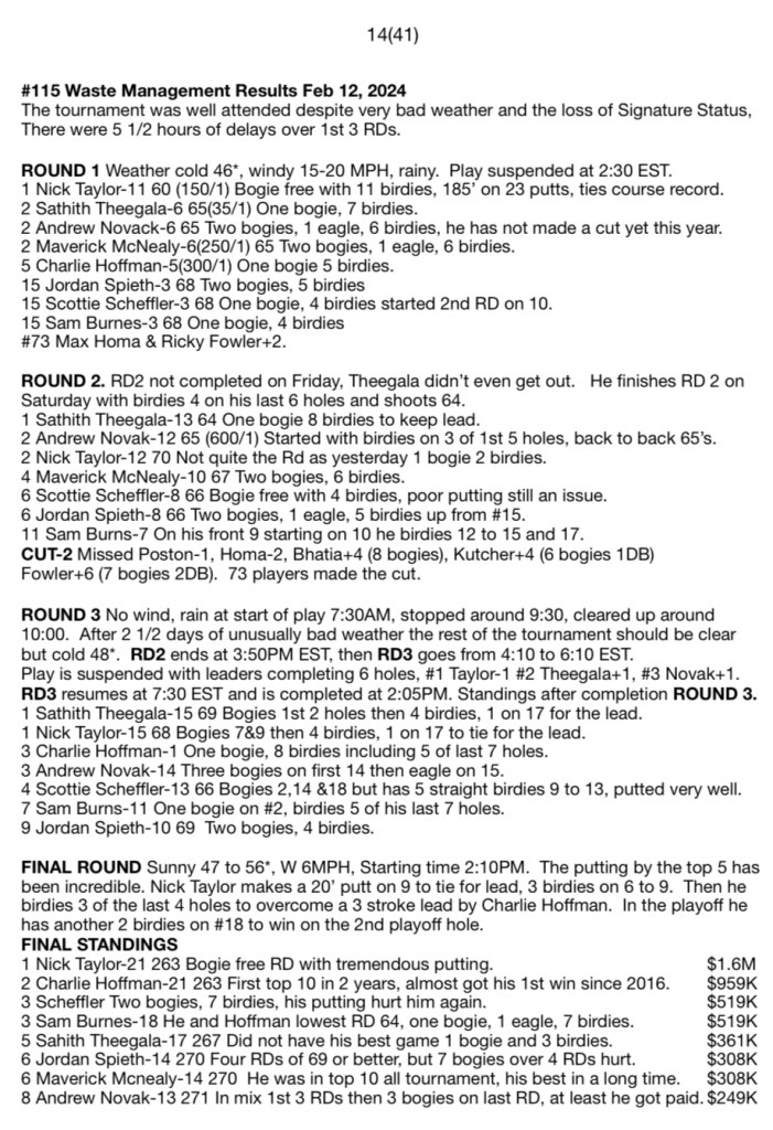 FINAL ROUND Sunny 47 to 56*, W 6MPH, Starting time 2:10PM. The putting by the top 5 has been incredible. Nick Taylor makes a 20’ putt on 9 to tie for lead, 3 birdies on 6 to 9. Then he birdies 3 of the last 4 holes to overcome a 3 stroke lead by Charlie Hoffman. In the playoff he has another 2 birdies on #18 to win on the 2nd playoff hole.