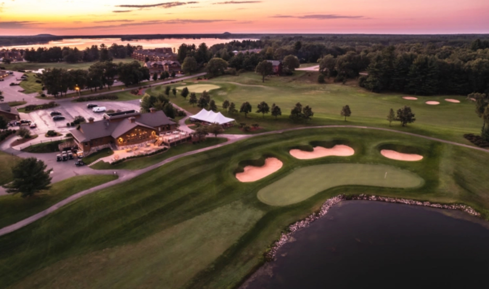 A lake guards the entire right side of the kidney shaped green and 3 bunkers to the left.