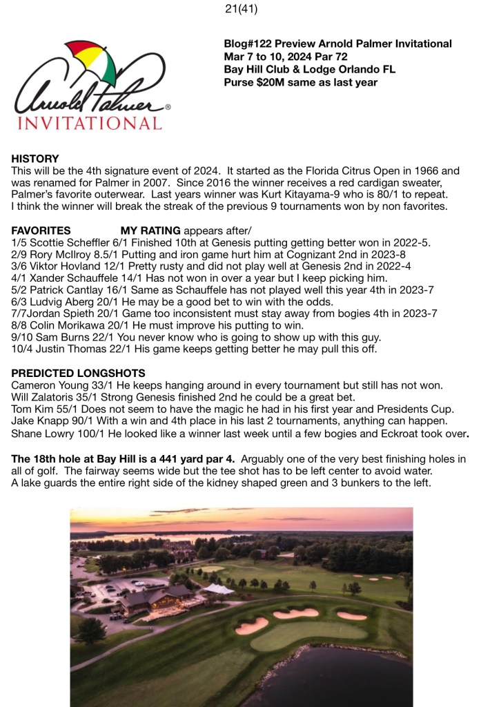 This will be the 4th signature event of 2024. It started as the Florida Citrus Open in 1966 and was renamed for Palmer in 2007. Since 2016 the winner receives a red cardigan sweater, Palmer’s favorite outerwear. Last years winner was Kurt Kitayama-9 who is 80/1 to repeat.