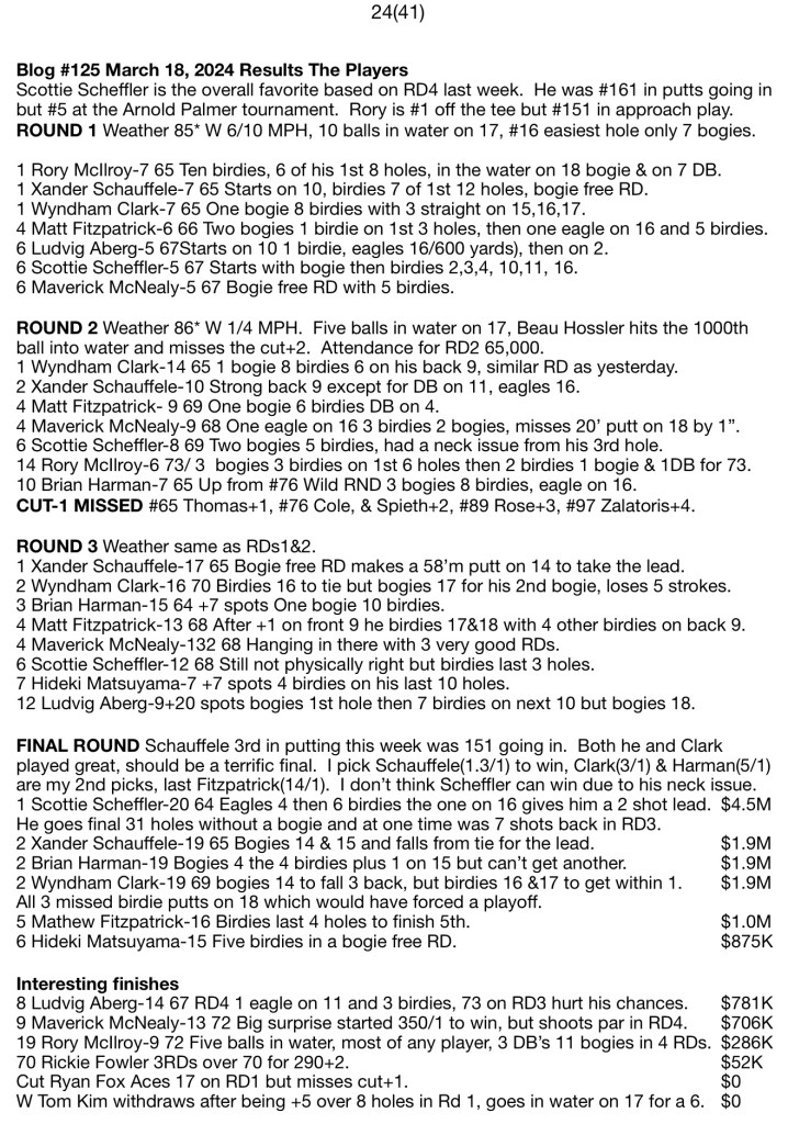 FINAL ROUND Schauffele 3rd in putting this week was 151 going in. Both he and Clark played great, should be a terrific final. I pick Schauffele(1.3/1) to win, Clark(3/1) & Harman(5/1) are my 2nd picks, last Fitzpatrick(14/1). I don’t think Scheffler can win due to his neck issue.