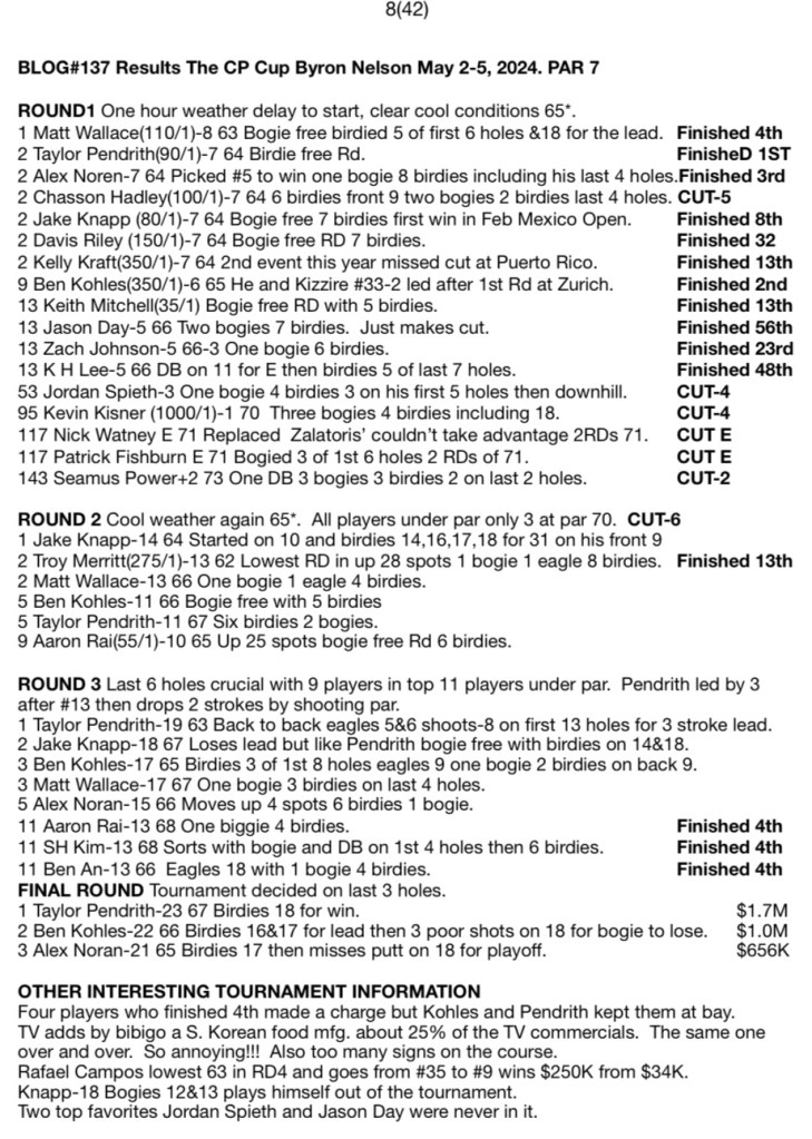 BLOG#137 Results The CP Cup Byron Nelson May 2-5, 2024. PAR 7