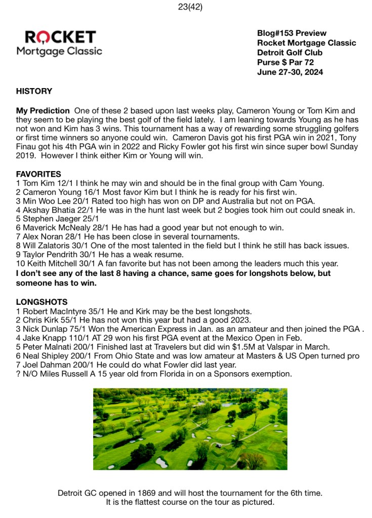 My Prediction One of these 2 based upon last weeks play, Cameron Young or Tom Kim and they seem to be playing the best golf of the field lately. I am leaning towards Young as he has not won and Kim has 3 wins. This tournament has a way of rewarding some struggling golfers or first time winners so anyone could win. Cameron Davis got his first PGA win in 2021, Tony Finau got his 4th PGA win in 2022 and Ricky Fowler got his first win since super bowl Sunday 2019. However I think either Kim or Young will win.