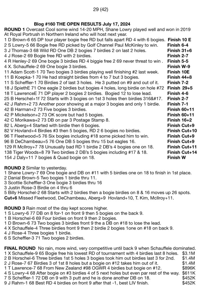 Blog #160 THE OPEN RESULTS July 17, 2024