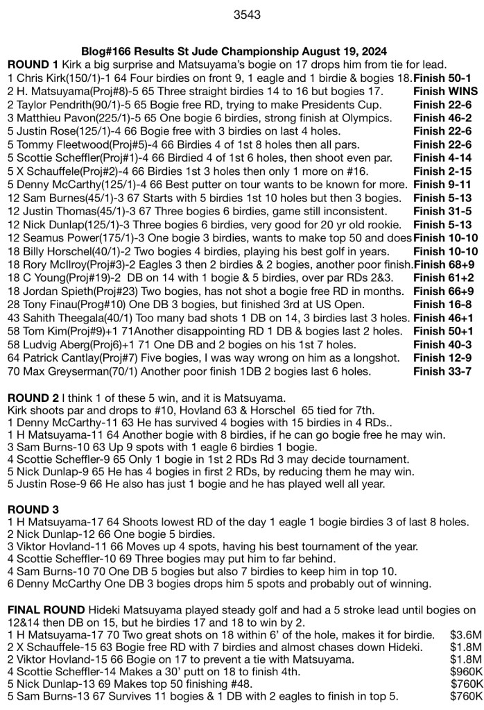 3 Matthieu Pavon(225/1)-5 65 One bogie 6 birdies, strong finish at Olympics. Finish 46-2