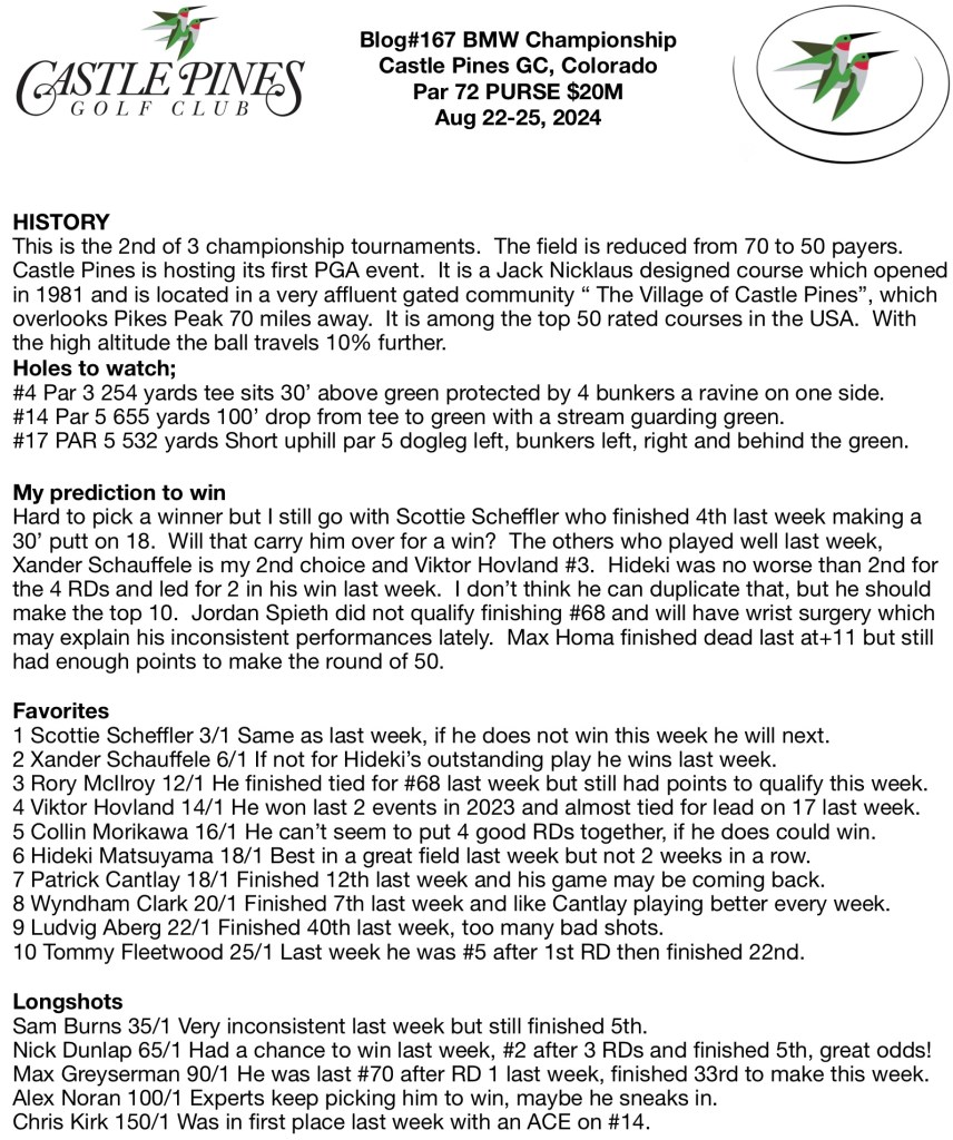 Hard to pick a winner but I still go with Scottie Scheffler who finished 4th last week making a 30’ putt on 18. Will that carry him over for a win? The others who played well last week,