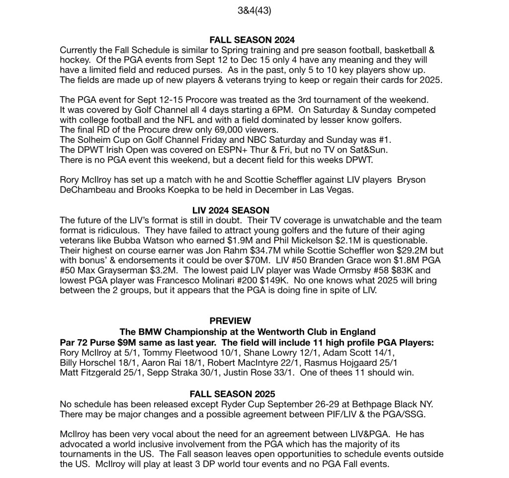 Currently the Fall Schedule is similar to Spring training and pre season football, basketball & hockey. Of the PGA events from Sept 12 to Dec 15 only 4 have any meaning and they will have a limited field and reduced purses. As in the past, only 5 to 10 key players show up.