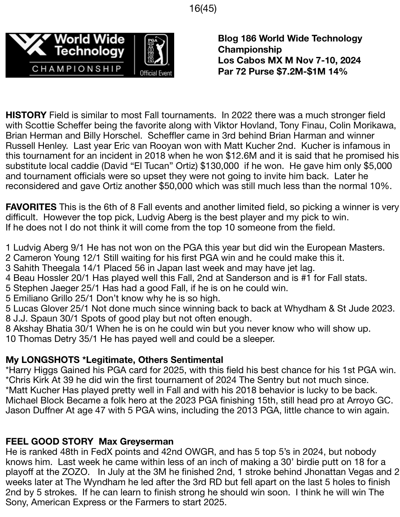 FAVORITES This is the 6th of 8 Fall events and another limited field, so picking a winner is very difficult. However the top pick, Ludvig Aberg is the best player and my pick to win.