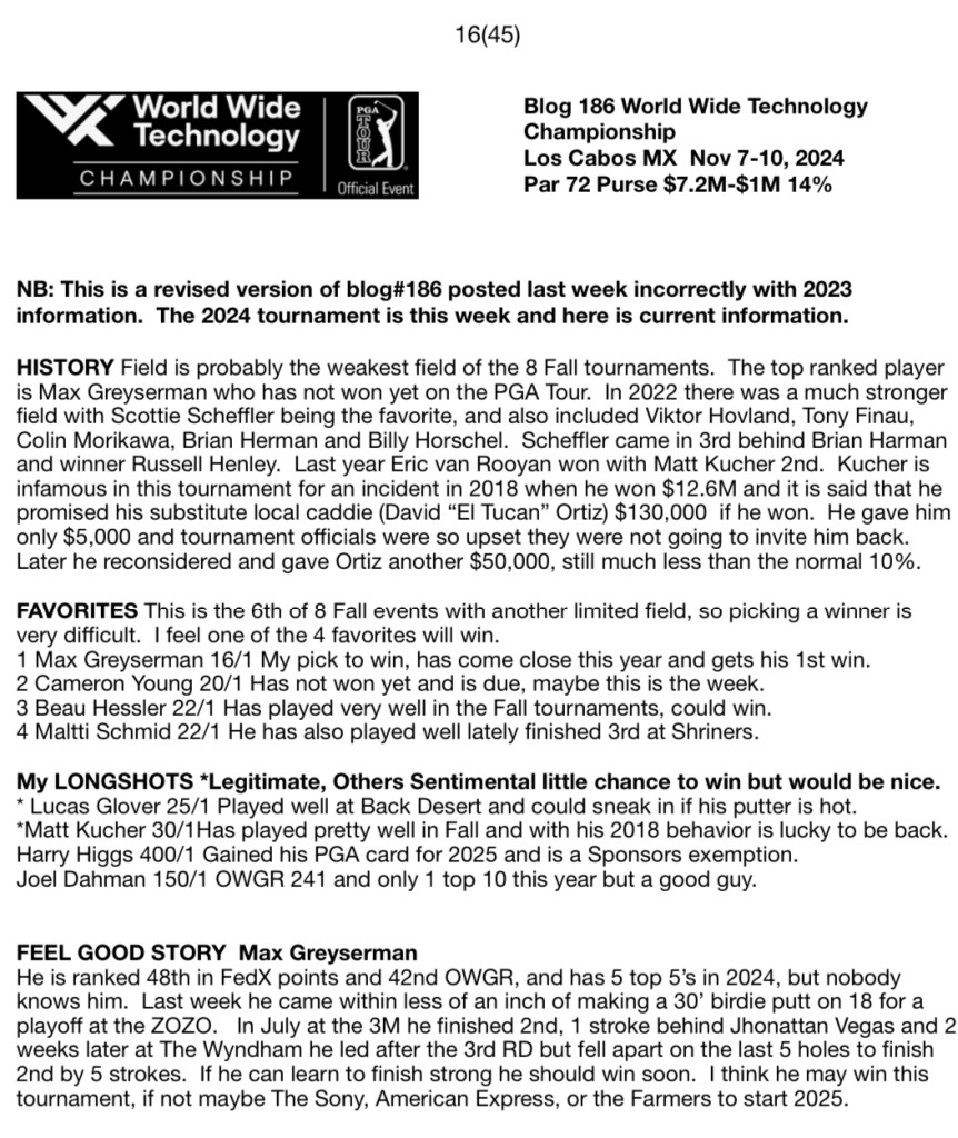 HISTORY Field is probably the weakest field of the 8 Fall tournaments. The top ranked player is Max Greyserman who has not won yet on the PGA Tour. In 2022 there was a much stronger field with Scottie Scheffler being the favorite, and also included Viktor Hovland, Tony Finau, Colin Morikawa, Brian Herman and Billy Horschel. Scheffler came in 3rd behind Brian Harman and winner Russell Henley. Last year Eric van Rooyan won with Matt Kucher 2nd. Kucher is infamous in this tournament for an incident in 2018 when he won $12.6M and it is said that he promised his substitute local caddie (David “El Tucan” Ortiz) $130,000 if he won. He gave him only $5,000 and tournament officials were so upset they were not going to invite him back. Later he reconsidered and gave Ortiz another $50,000, still much less than the normal 10%.