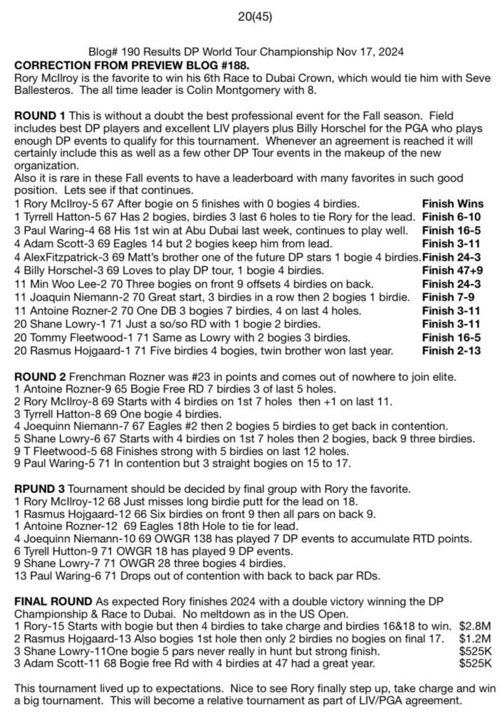Blog# 190 Results DP World Tour Championship Nov 17, 2024