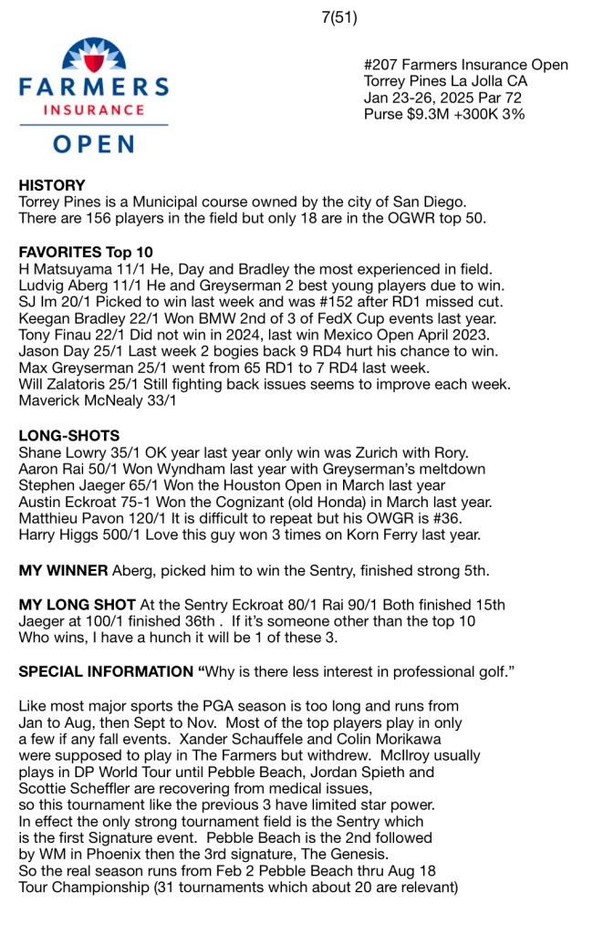 Like most major sports the PGA season is too long and runs from Jan to Aug, then Sept to Nov. Most of the top players play in only a few if any fall events. Xander Schauffele and Colin Morikawa were supposed to play in The Farmers but withdrew. McIlroy usually plays in DP World Tour until Pebble Beach, Jordan Spieth and Scottie Scheffler are recovering from medical issues, so this tournament like the previous 3 have limited star power. In effect the only strong tournament field is the Sentry which is the first Signature event. Pebble Beach is the 2nd followed by WM in Phoenix then the 3rd signature, The Genesis. So the real season runs from Feb 2 Pebble Beach thru Aug 18 Tour Championship (31 tournaments which about 20 are relevant)