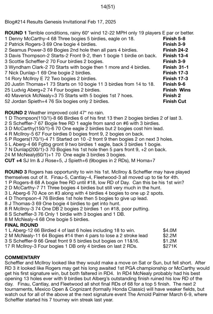 Blog#214 Results Genesis Invitational Feb 17, 2025