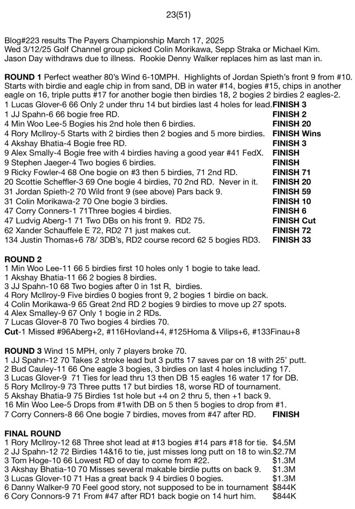 20 Scottie Scheffler-3 69 One bogie 4 birdies, 70 2nd RD. Never in it. FINISH 20