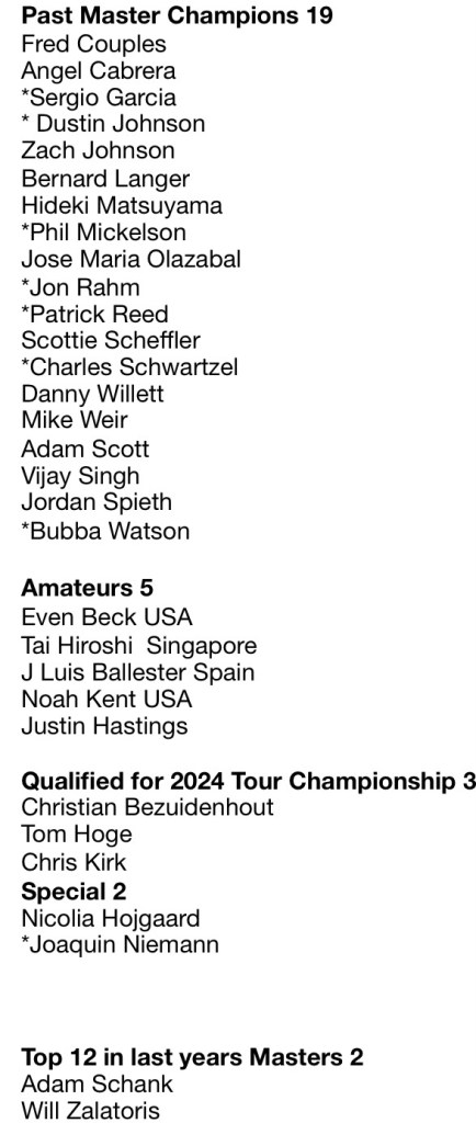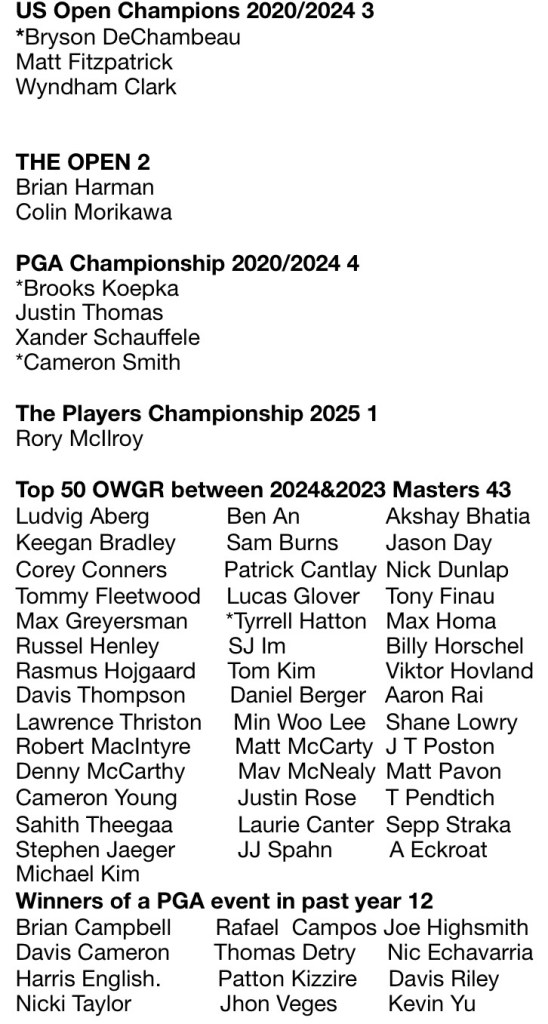 The 2025 Masters will have 96 players. All players receive a letter of invitation based on certain criteria. Here is a list of participants and the reason they qualified. There are several ways for qualifying, but only 1 is necessary. * indicates 12 LIV players in the field.