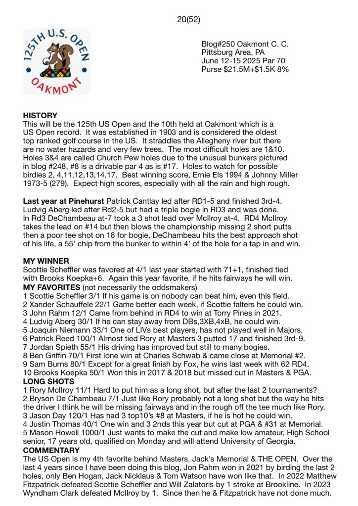 The US Open is my 4th favorite behind Masters, Jack’s Memorial & THE OPEN. Over the last 4 years since I have been doing this blog, Jon Rahm won in 2021 by birding the last 2 holes, only Ben Hogan, Jack Nicklaus & Tom Watson have won like that. In 2022 Matthew Fitzpatrick defeated Scottie Scheffler and Will Zalatoris by 1 stroke at Brookline. In 2023