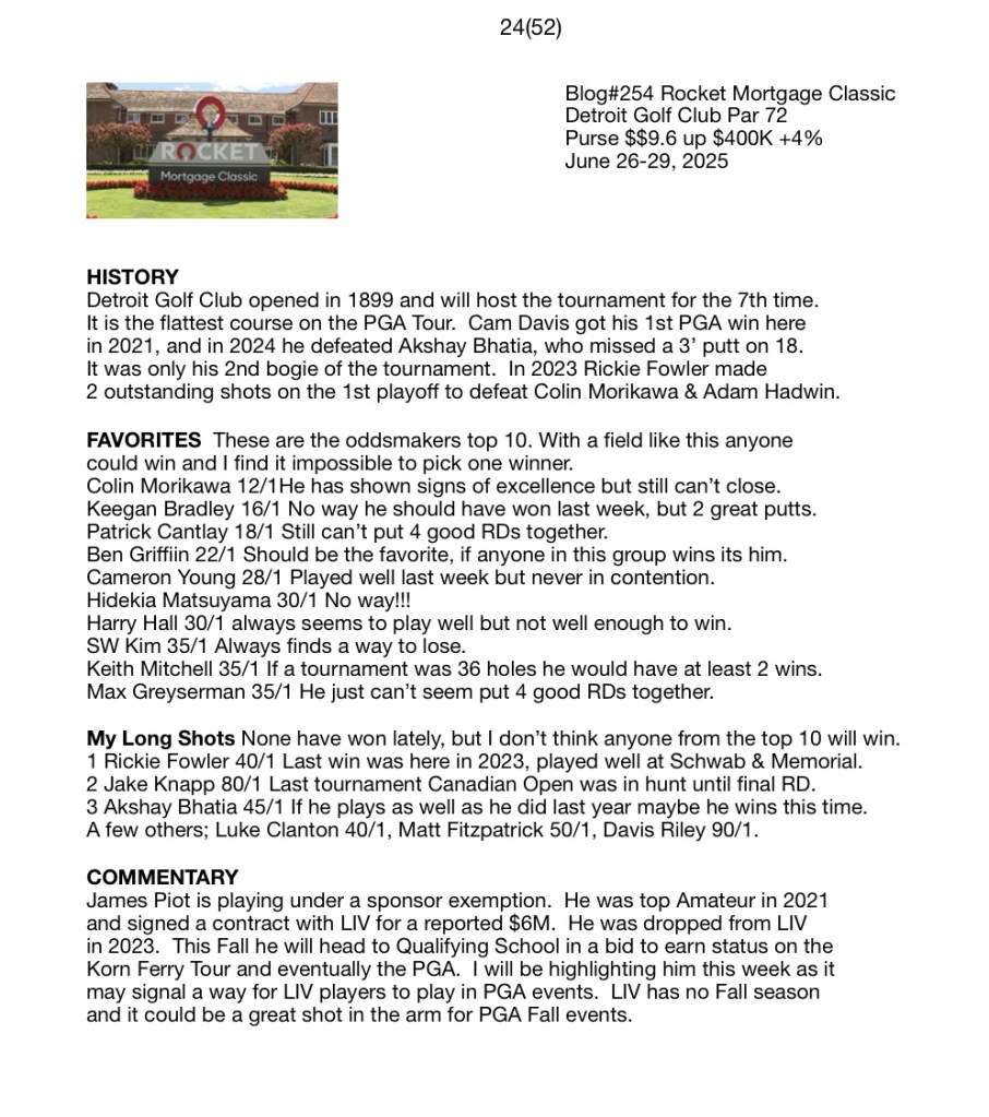 James Piot is playing under a sponsor exemption. He was top Amateur in 2021 and signed a contract with LIV for a reported $6M. He was dropped from LIV in 2023. This Fall he will head to Qualifying School in a bid to earn status on the Korn Ferry Tour and eventually the PGA. I will be highlighting him this week as it may signal a way for LIV players to play in PGA events. LIV has no Fall season and it could be a great shot in the arm for PGA Fall events.